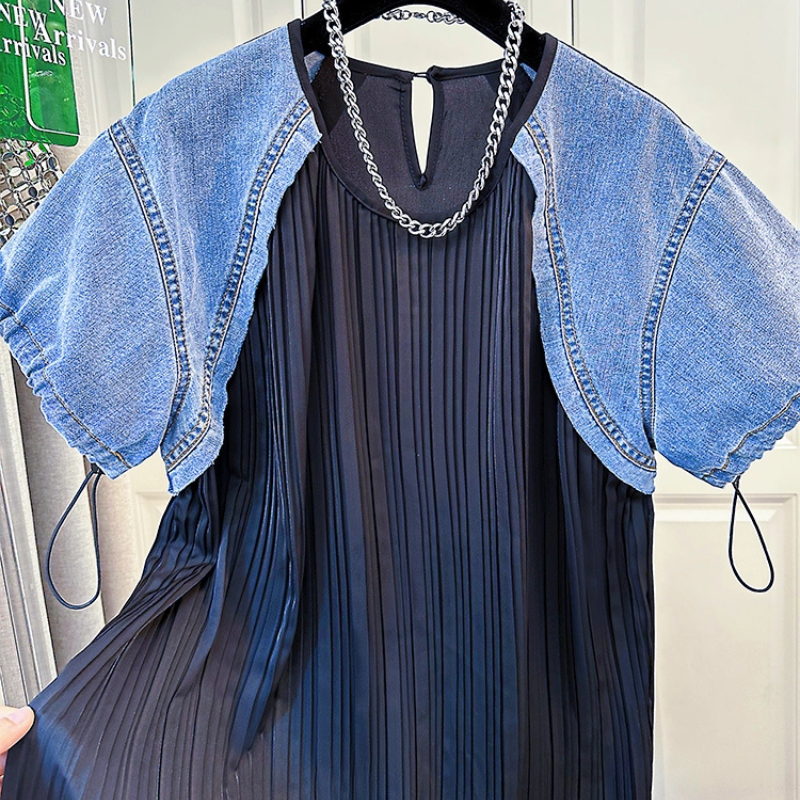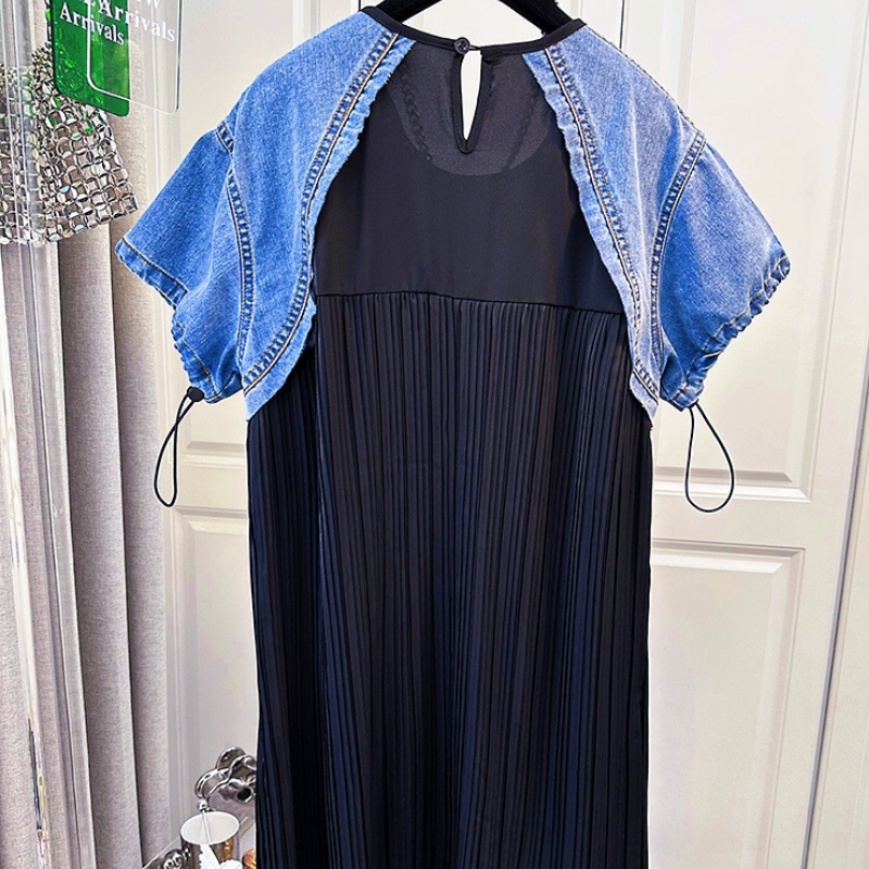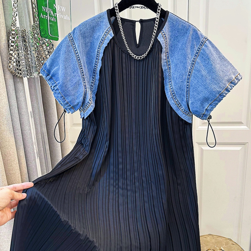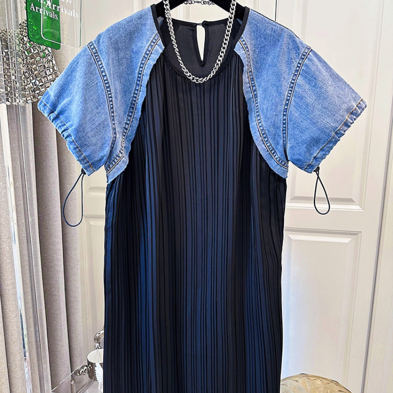 Melanie Pleated A-Line Dress With Denim Sleeve